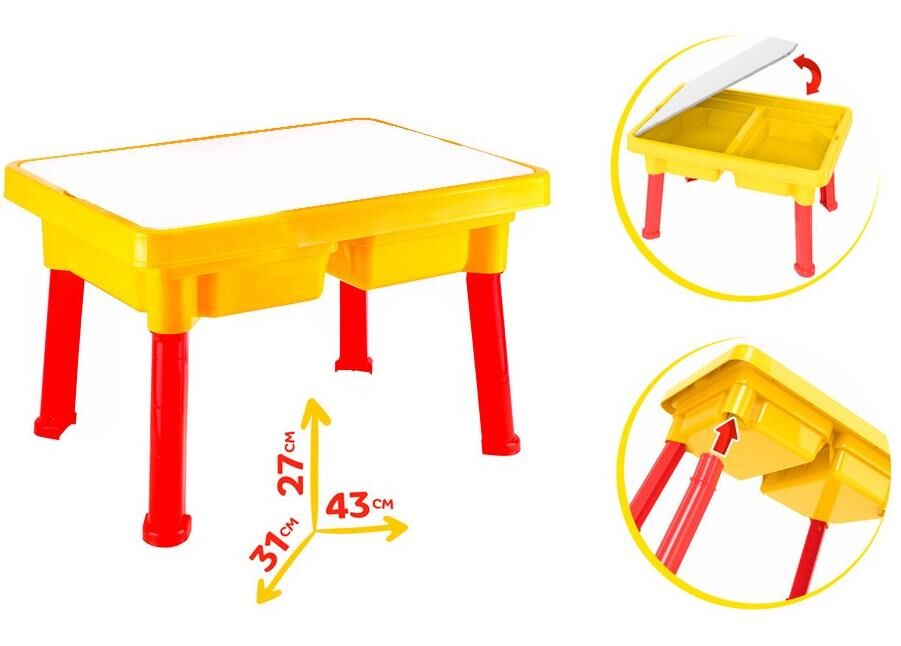 Столик складається з корпусу з двома нішами, кришки та ніжок. Його висота у зібраному вигляді з ніжками становить 27 см, і діткам зручно гратися на підлозі чи килимі. При потребі ніжки можна зняти та використовувати корпус з кришкою на справжньому столі. Звертаємо увагу, що в такому разі ніжки зручно розмістити в середині, в одній з ніш.