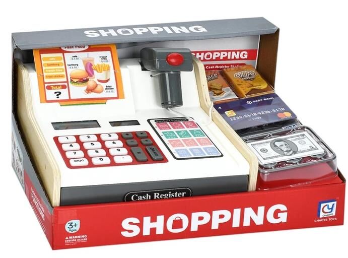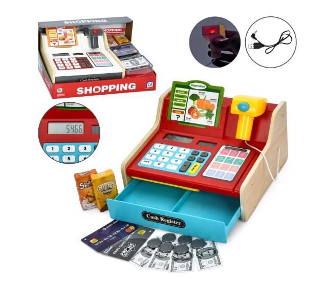 Іграшковий касовий апарат із дерев’яними вставками стане чудовим доповненням до сюжетних ігор у магазин. Має функціональний калькулятор і висувну шухлядку для зберігання іграшкових грошей. У комплект входять пластикові купюри, монети, банківські картки та муляжі продуктів. Сканер із підсвічуванням і звуковими ефектами зробить гру ще реалістичнішою. До набору включене меню із цінами, що дозволить дитині навчитися основ математичних дій.