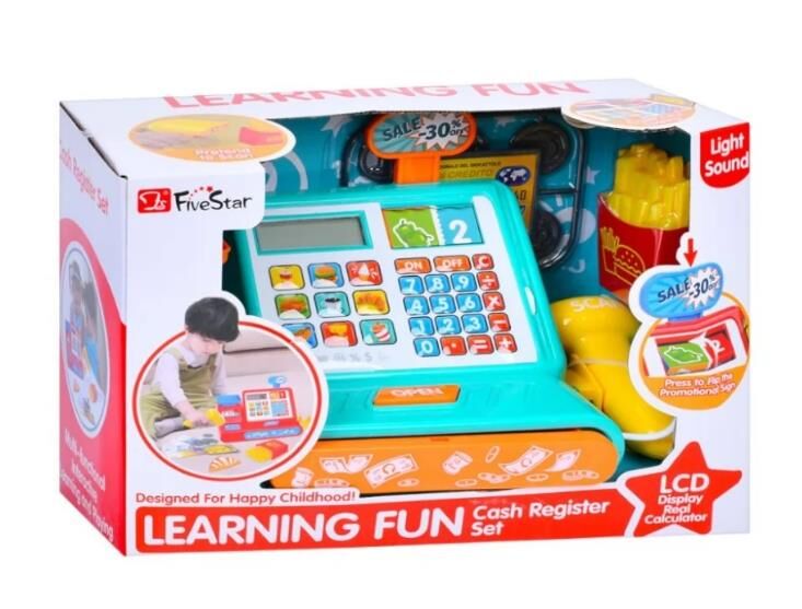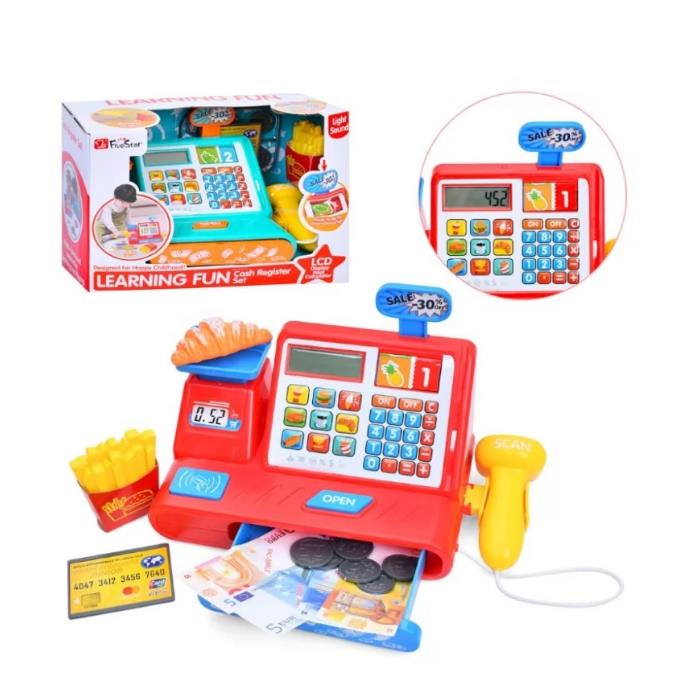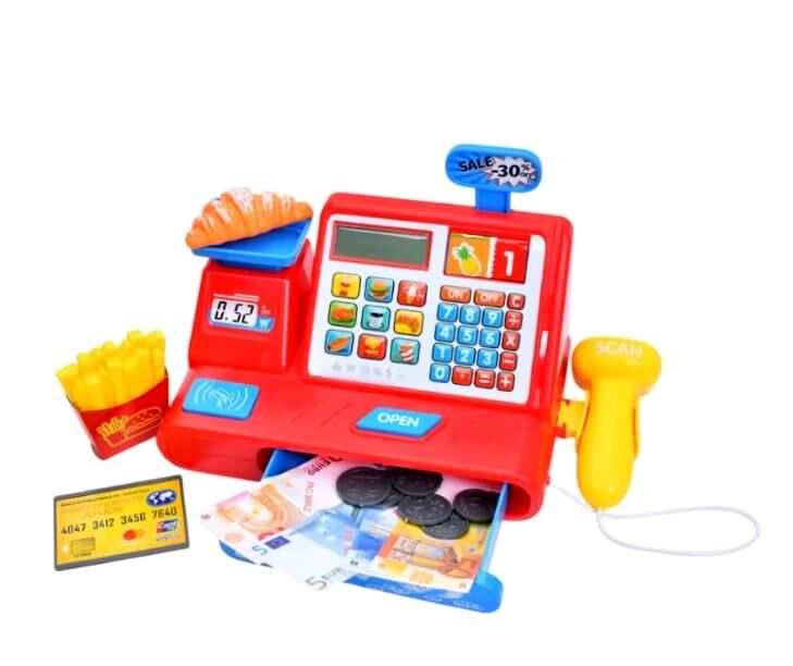 Іграшковий касовий апарат X858-1G калькулятор-сканер 26 см, зі звуком, світлом і грошима, 2 кольори. Іграшковий касовий апарат призначений для сюжетно-рольових ігор у магазині, допомагає дитині знайомитися з основами рахунку, поняттями грошей і покупок. Модель оснащена інтерактивним калькулятором, сканером із підсвічуванням і звуковими сигналами, а також висувною шухлядою для зберігання іграшкових грошей. У комплект входять купюри, монети, банківська картка, фішки та пластикові аксесуари для гри. Корпус виготовлений із пластику, безпечного для дітей і стійкого до механічних пошкоджень. Під час гри дитина може «пробивати» товари, «сканувати» покупки й користуватися калькулятором, розігруючи повноцінну роботу касира. Іграшка працює від батарейок, які встановлюються у нижній частині корпусу. Модель випускається у двох кольорах і постачається в коробці типу Window Box. Країна виробництва — Китай.