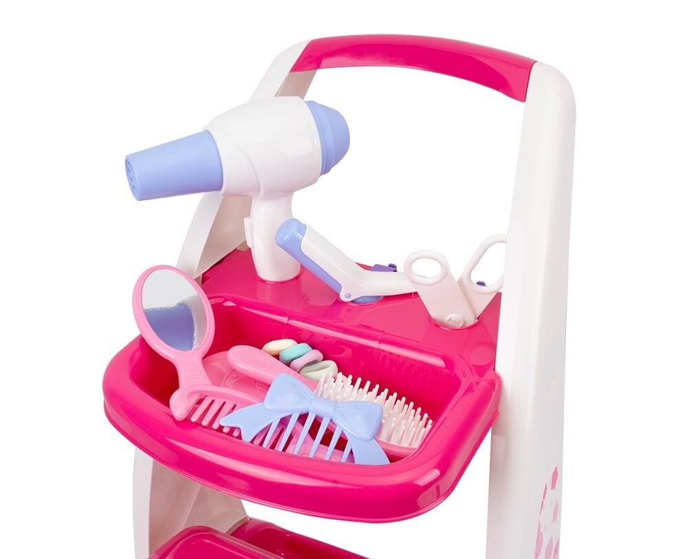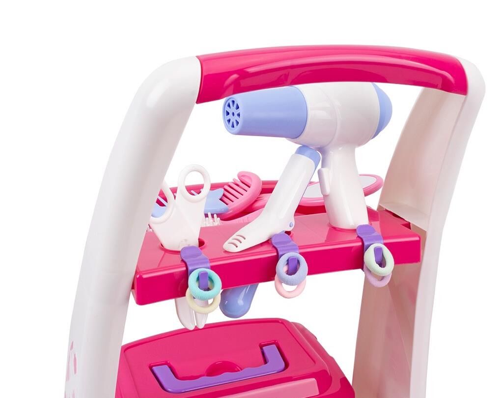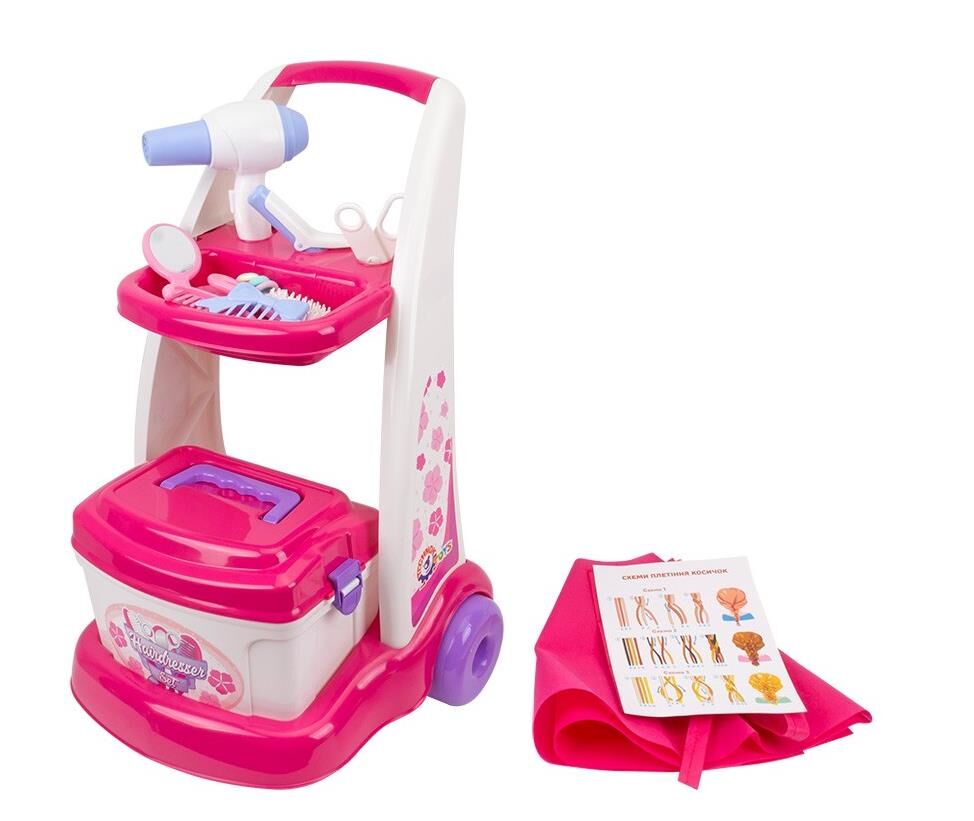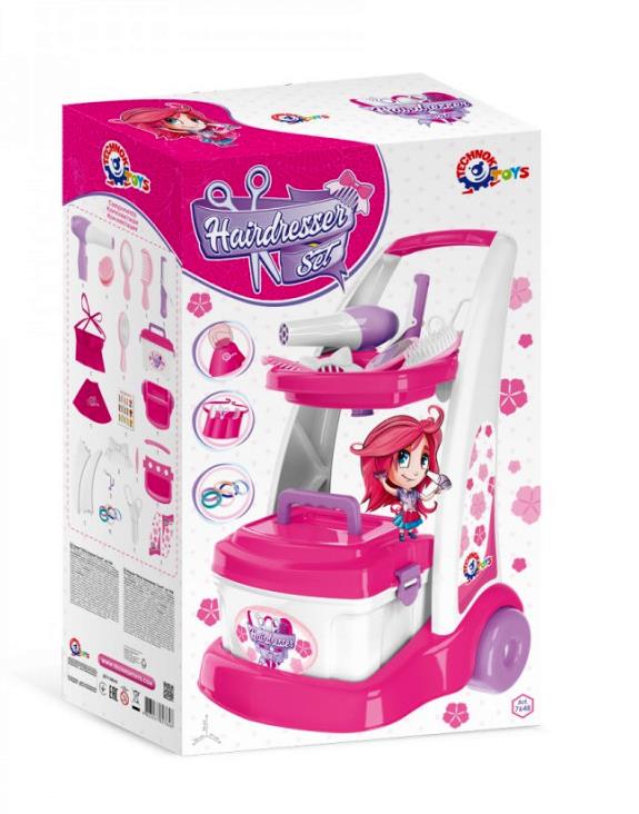 Власний професійний салон краси - мрія кожної дівчинки. Відкрити такий маленьким модницям допоможе "Набір перукаря ТехноК" з містким саквояжем та маневровим візком. У салоні можна зробити зачіску подружкам та матусі, накрутити волосся лялькам та, просто, припудрити носик. У наборі є різноманітні професійні інструменти на аксесуари. Для майстра-перукаря - пояс з кишеньками, щоб всі інструменти були під рукою. Не забруднити одяг клієнта допоможе спеціальна накидка на защіпці. У комплекті також є гребінець, щітка, плойка та шпилька у формі бантика для модної кучерявої зачіски. Дзеркальце з ручкою, пінцет та пудрениця будуть завжди під рукою для ідеального макіяжу. А щоб гарно просушити волосся та зробити легку укладку варто використати фен. Тепер у маленької модниці все буде все як справжній перукарні. Для ідеальної святкової зачіски у пригоді стануть 6 резинок для волосся та схема заплітання косичок. Такий набір принесе море радості маленьким модницям та зробить ігри дуже реалістичними. Розміри іграшкового приладдя оптимально розраховані для дитячих ручок. Також їх зручно взяти з собою на прогулянку чи у садок. Зберігати та переносити перукарські інструменти та аксесуари можна у місткому саквояжі на защіпках та на візочку. На нижній полиці візка є спеціальне місце для саквояжа, а на верхній полиці з трьома гачками розмістити дрібні елементи набору. Візок зручний та маневровий, добре їздить на різних поверхнях, стійкий до перекидань. З набором перукаря від ТехноК кожна дівчинка відчує себе справжній профі перукарської справи! Сюжетно-рольові ігри розвивають дитячу уяву, фантазію, мислення та дрібну моторику. Знайомлять дітей з основами гігієни та щоденно догляду. Такі ігри покращують комунікативні та соціальні навички. Іграшка виготовлена з міцного якісного пластику, без запаху. Комплектація: візок, саквояж, фен, плойка, гребінець, щітка, дзеркальце, 2 заколки гребінець, пудрениця, пінцет, ножиці, накидка, пояс, 6 резинок для волосся, інструкція для заплітання. Для дітей від 3-х років. Пакування – яскрава коробка 61,8х37,5х20 см.