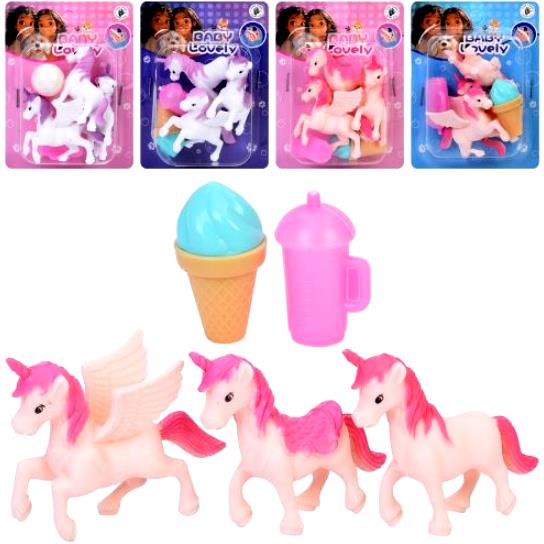Конячка LD6038K14 набір 3шт, єдиноріг 5см, пляшечка, морозиво, на листі,