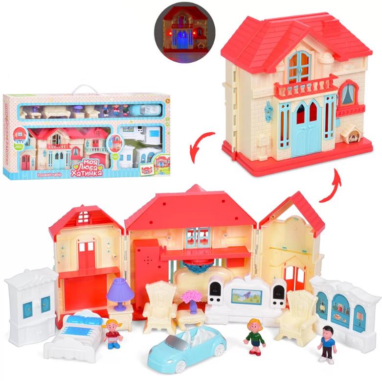 Будиночок WD-933E 38-19см, автомобіль 12см, фігурка 6см 3шт, меблі, звук, світло, на бат-ці. у кір-ці. Матеріал: пластмаса.