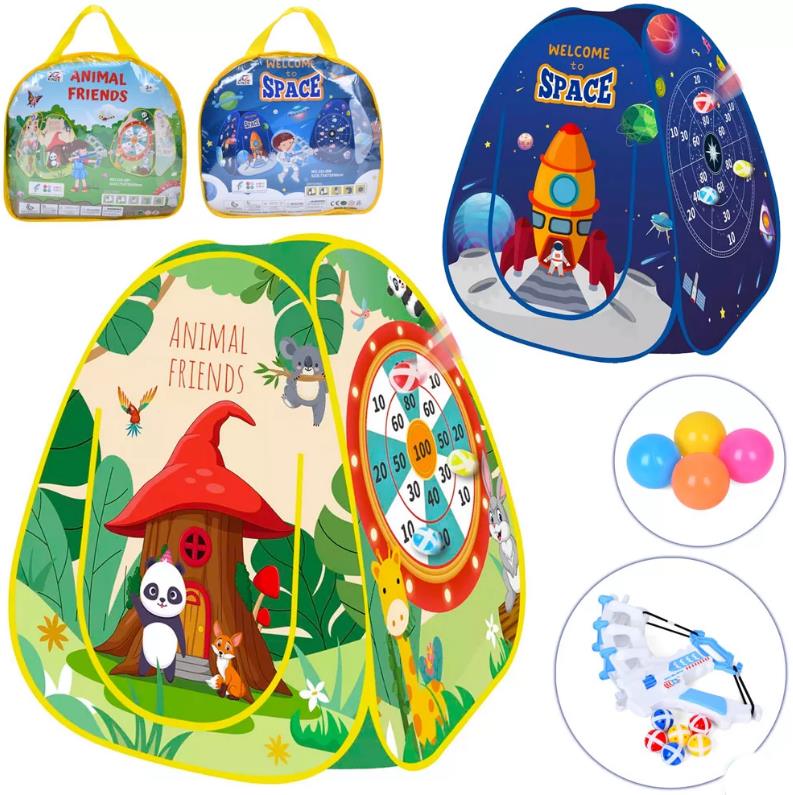 Намет MR 1261 піраміда, 75-75-в90см, мішень, 1вхід-накидка, лук, кульки з липучками, пластм. кульки, 2 види космос, , тварини, у сумці, 34-33-6. Материал: комбінований матеріал.