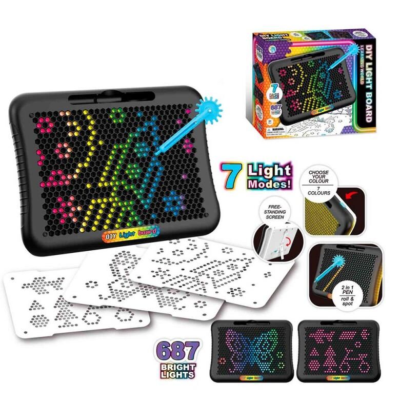 Особливості: Світлова дошка для малювання 12 режимів підсвічування,Яскраві світлові ефекти,Ручка 2в1 для малювання,Карти-трафарети для створення візерунків 3шт,Компактний розмір,Зручна для використання вдома та в дорозі,Підсвічування: світлодіодне,Живлення: 3×AAA (не входять до комплекту),Розмір дошки: 23×18×4,5 см