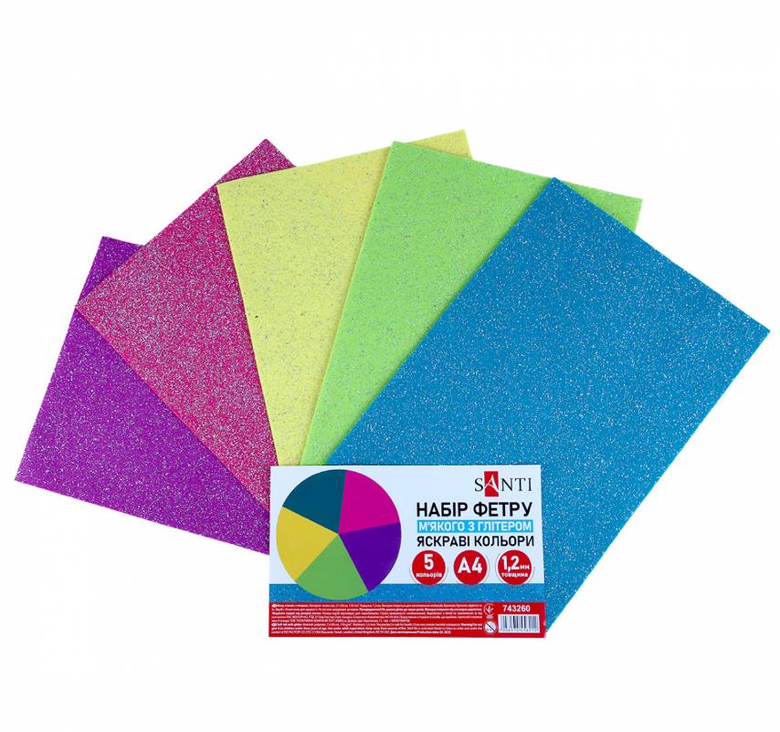 Фетр м'який з глітером А4 5 аркушів яскраві кольори 743260 Santi
