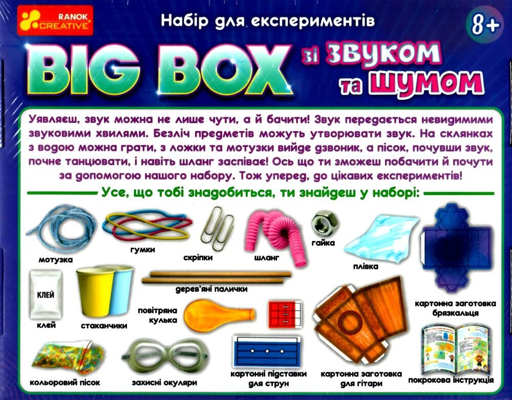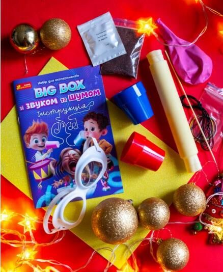 Унікальний набір для дослідів відкриє дітям захопливий світ експериментів зі звуком! Усередині ви знайдете 10 цікавих дослідів: шнуровий телефон, дзвоник із ложки, гітару зі струн, музику на склянках, шланг, який співає, брязкальце, «муху» в повітряній кульці та багато іншого.