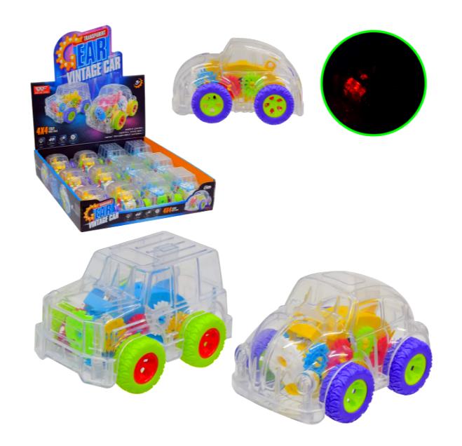 Маленькі інерційні машинки з різнокольоровими шестеренками. Яскраві світлові ефекти. Працює від трьох батарейок типу AG13 .