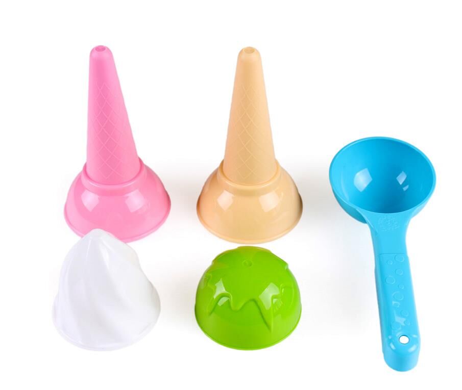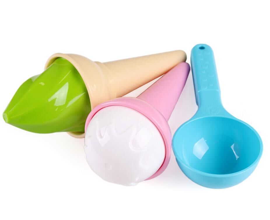 Приготувати іграшкове морозиво з піску малечі допоможуть: ложка для морозива, стаканчик, що імітує вафельний ріжок і, звичайно, різні формочки для кульок морозива. Така іграшка буде доречною на пляжі, в пісочниці на дитячому майданчику чи у дитсадку.