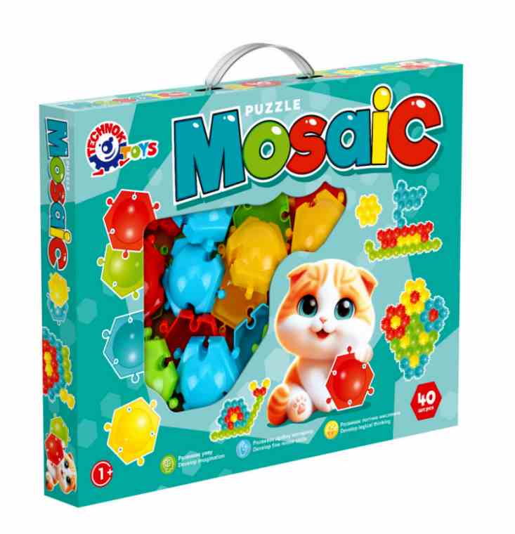 Мозаїка-пазли ТехноК – це розвиваюча іграшка, що гармонійно поєднує в собі елементи класичної мозаїки, конструктора та пазлів. Вона спеціально розроблена для стимулювання ключових навичок у дітей раннього віку, починаючи вже від 1 року. Набір складається з 40 великих, зручних для дитячої ручки шестикутних елементів яскравих кольорів (чотири кольори). Розмір кожної фішки – 60 мм, що є безпечним для малюків і комфортним для збирання. Завдяки унікальній формі та системі з'єднання, ці деталі дозволяють дитині створювати необмежену кількість візерунків, форм та фігурок, розвиваючи при цьому уяву, просторове мислення та художній смак. Гра з мозаїкою-пазлами ТехноК відмінно тренує дрібну моторику пальців та координацію рухів, що є надзвичайно важливим для розвитку дитини та підготовки руки до письма. Яскраві кольори деталей сприяють вивченню основних кольорів, а процес з'єднання елементів навчає логічному мисленню та вмінню знаходити рішення. Великою перевагою цієї мозаїки є можливість складати візерунки на будь-якій плоскій поверхні – столі, підлозі чи навіть на килимі, що робить гру зручною в будь-яких умовах. Кожен елемент має приємну на дотик гладеньку текстуру, збагачуючи тактильний досвід дитини. В комплекті є інструкція з прикладами візерунків для натхнення. Яскрава коробка з віконечком дозволяє побачити деталі перед покупкою. Мозаїка-пазли ТехноК – це не просто іграшка, це ефективний інструмент для всебічного розвитку дитини в ігровій формі, що принесе багато радісних моментів та нових відкриттів.
