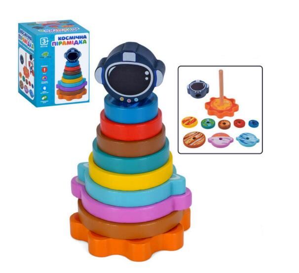 Дерев'яна пірамідка призначена для розвитку координації, дрібної моторики та початкових навичок сортування за розміром. Основа має центральний стрижень, який по черзі нанизуються вісім різнокольорових кілець. Кожен елемент відрізняється діаметром та кольором, що формує логічну послідовність при складанні. Верхня частина представлена декоративною фігурою у космічній тематиці, що робить процес різноманітнішим. Усі деталі виконані з дерева та пофарбовані стійкими барвниками. Поверхня гладка, без гострих кутів, що підходить для регулярного використання. Набір поставляється в коробці і орієнтований на ранній розвиток через дії, що повторюються, тренування координації та ознайомлення з базовими поняттями розміру.