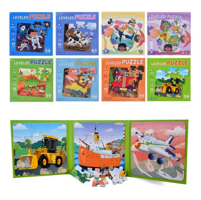 Дерев'яні пазли 3-в-1 призначені для збирання трьох окремих сюжетних зображень на загальному ігровому полі. Набір містить магнітні елементи, що утримуються на поверхні під час гри та спрощують роботу з деталями. Ігрове поле розміром 56×18 см розділене на три секції, кожна з яких відповідає окремому комплекту пазлів. Залежно від варіанта зображення кількість елементів може відрізнятись – 37, 48, 61 або 75 деталей. Елементи виготовлені з дерева та мають гладкі краї. Тематичні картинки представлені у восьми видах, що дозволяє вибрати відповідний сюжет. Набір поставляється в пакеті та підходить для ігрової та навчальної діяльності, пов'язаної з розвитком логіки, уваги та візуального сприйняття.