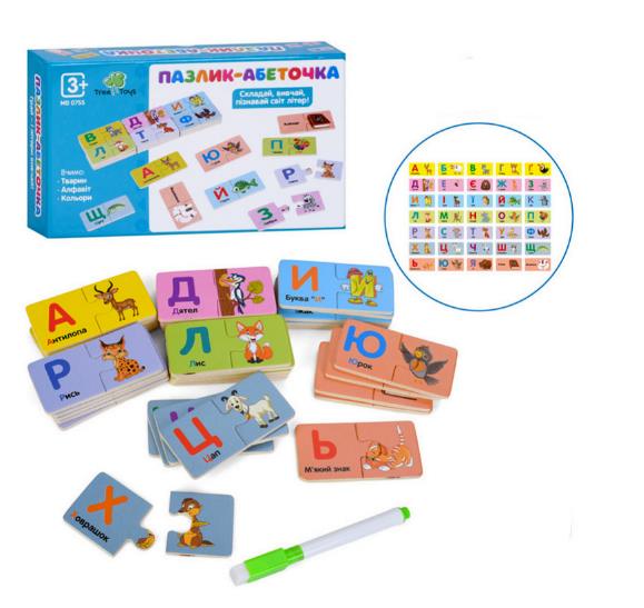 Дерев'яне доміно MD 0755 – навчальна модель, в якій елементи виконані у вигляді подвійних карток з українськими літерами, зображеннями тварин та кольоровими маркерами. Кожна картка містить літеру та відповідний образ, що дозволяє поєднувати символ із конкретним предметом та розширювати словниковий запас. Завдяки парному формату елементів дитина може складати «ланцюжки» за принципом класичного доміно або використовувати картки як окремий матеріал для вивчення алфавіту та базових понять. Додатково в комплекті є маркер, що дозволяє виконувати прості вправи на запис або обведення, якщо це передбачено на картах. Матеріал – дерево з рівною поверхнею та друкованими ілюстраціями. Модель підходить для розвитку уваги, зорової асоціації, логічного мислення та початкових мовних навичок.