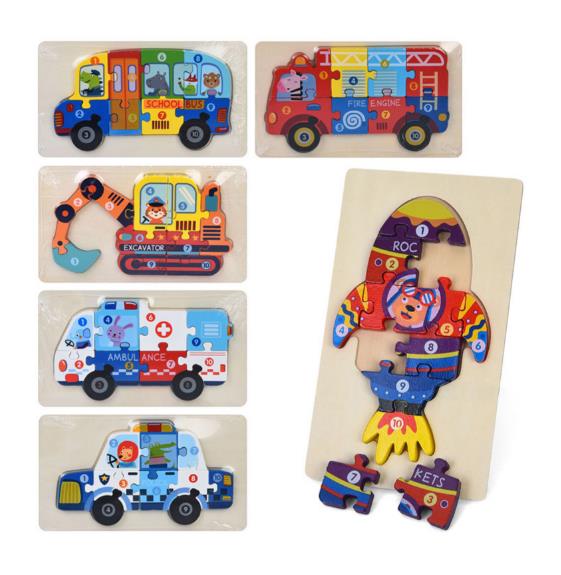 Дерев'яні пазли MD 0768 – серія тематичних наборів на основі транспортних засобів, у кожному з яких зображено окремий вид техніки: шкільний автобус, пожежна машина, екскаватор, швидка, поліцейська машина, ракета тощо. Кожна модель складається з 10 об'ємних деталей, які встановлюються у відповідні виїмки на дерев'яній основі розміром 22x13x1 см. Окремі елементи мають прості англійські підписи, які знайомлять дитину з базовою лексикою та допомагають запам'ятовувати слова у процесі гри. Фігури мають чіткі контури, яскраве забарвлення та зручний розмір, що дозволяє дитині легко брати елементи в руку та встановлювати їх на своє місце. Такий формат сприяє розвитку дрібної моторики, просторового мислення, зорової координації та знайомить із тематикою транспорту. У наборі є 6 різних варіантів зображень, кожен з яких поставляється окремо.