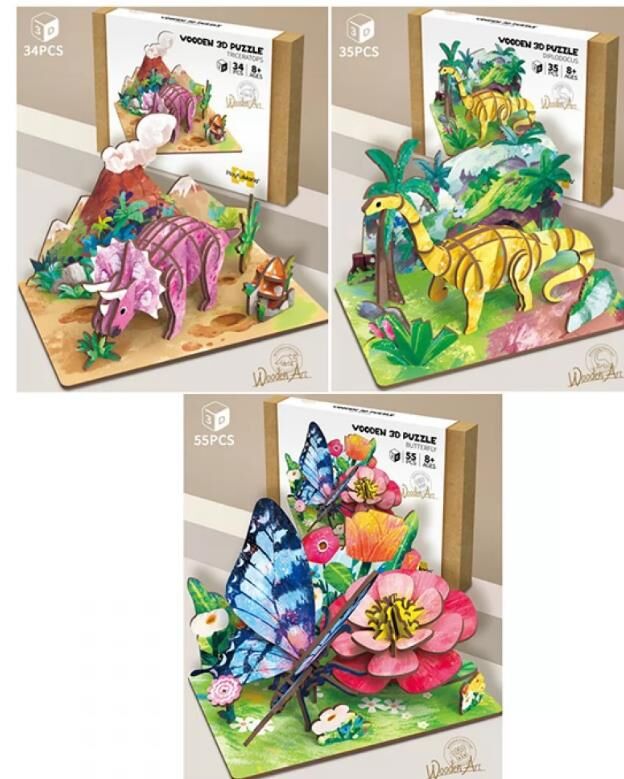 Дерев'яні іграшки Пазлі 3D. Від 34 деталей. 3 види Динозавр + вулкан, динозавр, метелик. У коробці 18-12,5-2 див