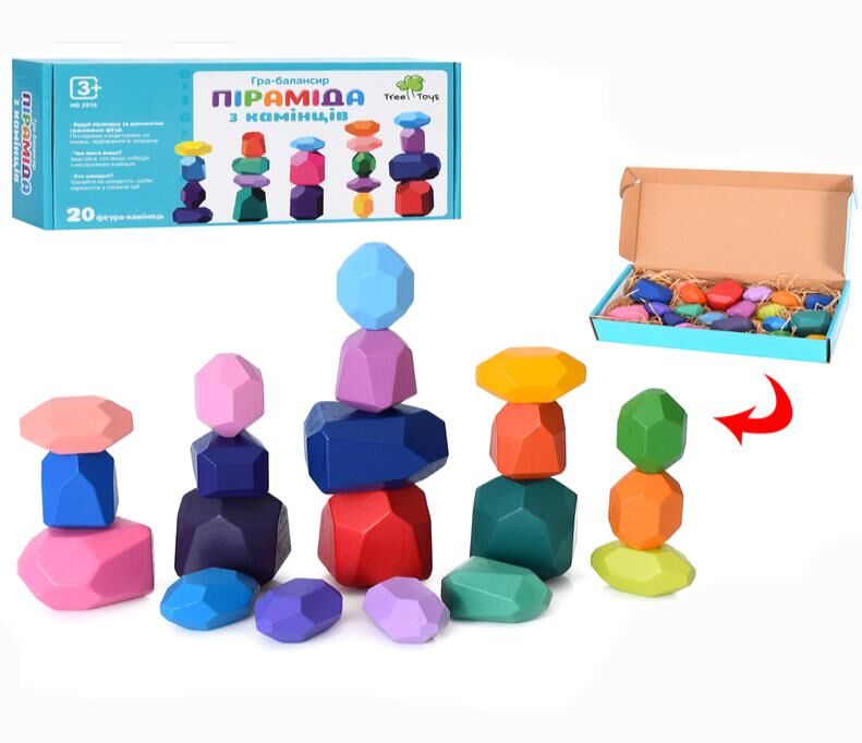Популярна у всьому світі японська гра - головоломка, обов'язково сподобається як маленьким діткам так і серйозним дорослим. Ця гра для конструювання та роздуми. Сенс гри полягає у вибудовуванні збалансованої пірамідки з неправильних формою дерев'яних багатогранників. Вона є чимось середнім між кубиками і конструктором, поєднуючи у собі переваги обох ігор. Варіантів спорудження вежі з каміння безліч. Гра чудово розвиває посидючість, терпіння, координацію та моторику. Грати можна як поодинці, так і в компанії, по черзі піднімаючи камінці і стежачи за балансуванням пірамідки. "Камінці" виконані з дерева вручну, вони гладкі та приємні на дотик з плавними краями, і, на відміну від справжніх, теплі. Матеріал "каменів" – натуральне дерево.