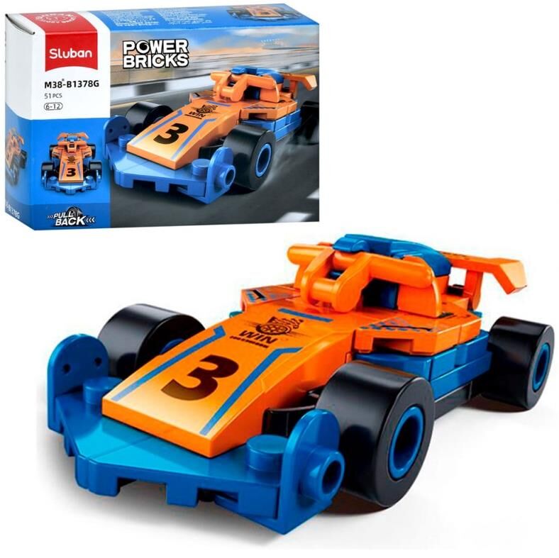 Конструктор Sluban M38-B1378 належить серії Power Bricks та дозволяє зібрати модель гоночного автомобіля з інерційним механізмом. У наборі 50 деталей, з яких складається компактна машина з колесами, що рухаються, і водійською фігуркою. Модель має спортивний дизайн і представлена в кількох колірних варіантах, що робить її цікавою для колекціонування або гри з іншими наборами серії. Інерційний механізм дозволяє запускати автомобіль по поверхні, що сприяє розвитку координації рухів та інтересу до техніки. Конструктор сумісний з іншими блоковими конструкторами аналогічного формату.