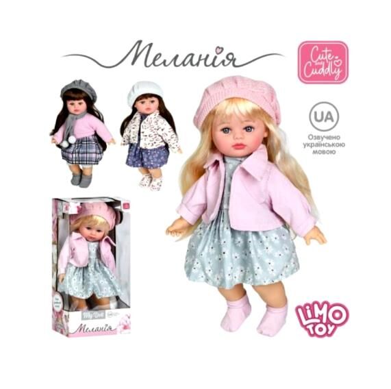 ялька Меланія M 6199 I UA призначена для сюжетно-рольових ігор дітей дошкільного віку. Іграшка має висоту 39 см і виконана з комбінації пластику та текстилю. Тіло м’яконнабивне, кінцівки рухомі, що дозволяє змінювати положення ляльки під час гри. Вона відтворює 5 українських пісень, які активуються за допомогою механізму з живленням від батарейок. Волосся можна розчісувати, що робить гру більш реалістичною. Лялька одягнена у комплект текстильного одягу, включно з сукнею, курткою, шкарпетками та береткою. Модель бренду Limo Toy сприяє розвитку уяви, мовлення та дрібної моторики дитини.