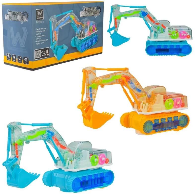 Музичний дитячий екскаватор 9813 – це чудовий подарунок для малю.Іграшка оснащена двома режимами гри: перший режим включає світлові ефекти;другий режим – запускає світлові та звукові ефекти, а також дозволяє екскаватору самостійно пересуватися. Екскаватор має прозорий корпус, за яким видно всі шестірні. Під час руху шестерні починають обертатися, привертаючи увагу малюка. За допомогою такої іграшки малюк розвиває рухові та слухові навички, тренує пам'ять, уяву та фантазію.