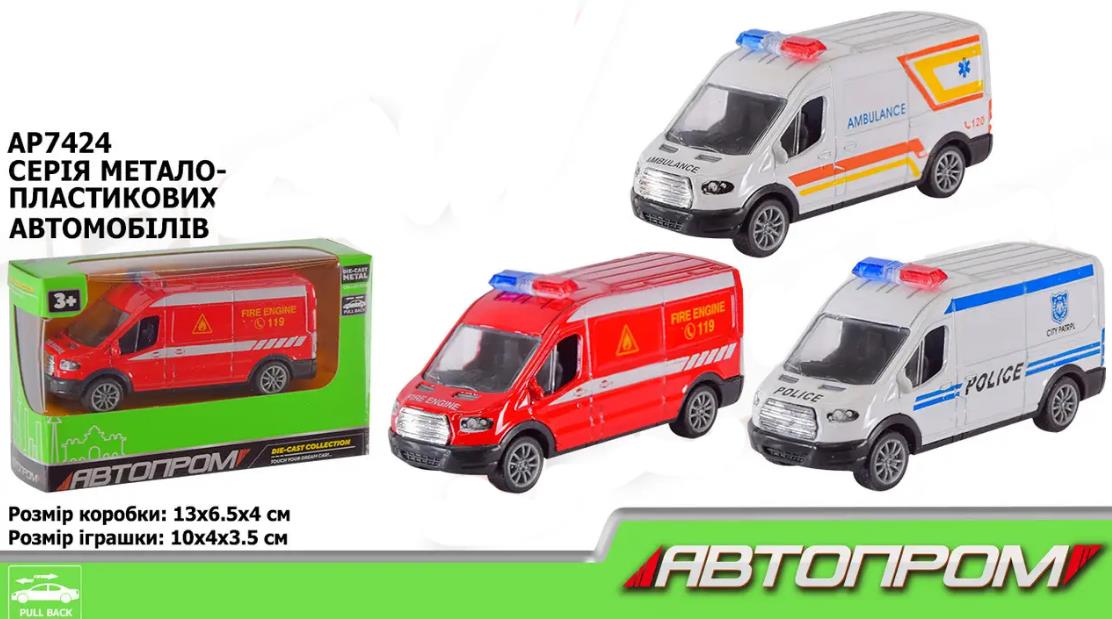 Металева машинка АВТОПРОМ AP7424 - реалістична модель спецтехніки в масштабі 1:48, представлена в трьох варіантах: поліція, швидка допомога та пожежна машина. Іграшка оснащена інерційним механізмом, завдяки якому машинка швидко набирає швидкість та плавно рухається вперед.
