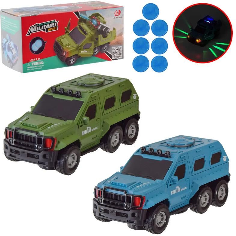 Джип 22 см. Має такі ефекти як музика, світло, стріляє дисками. Працює від батарейок. Це відмінний подарунок для хлопчика. Автомобіль виготовлений з якісних міцних матеріалів. Дитина буде розвивати уяву та фантазію, дрібну моторику і просторове мислення під час гри з машинкою.