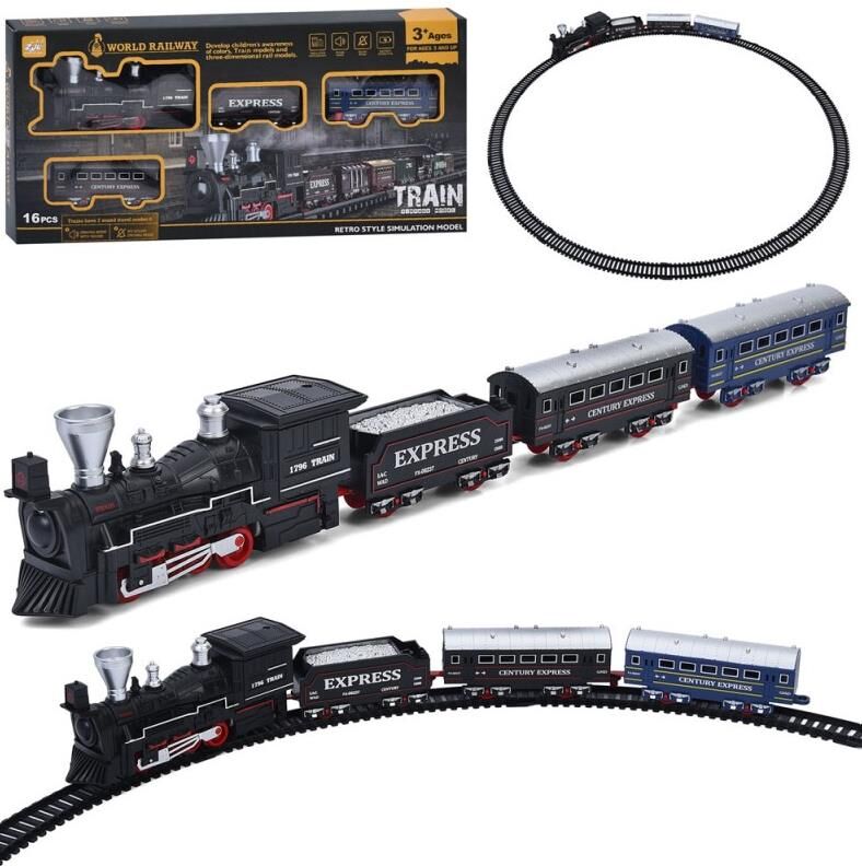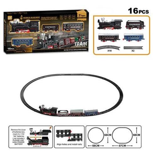 гровий набір залізниця 9299-81 — це розширена версія класичного поїзда з трьома вагонами, що рухається по колії діаметром 87 см. Локомотив виконаний у вінтажному стилі з реалістичними деталями та оснащений звуковими ефектами, що імітують роботу справжнього паровоза. Комплект складається з 16 елементів, включаючи локомотив, три вагони (пасажирські та вантажні) та сегменти колії, які легко з’єднуються. Іграшка працює від батарейок, що розміщуються у корпусі локомотива. Модель підходить для сюжетних ігор, стимулює розвиток логіки, уяви та моторики. Постачається у коробці типу Window Box із прозорим оглядовим вікном. Вироблено в Китаї.