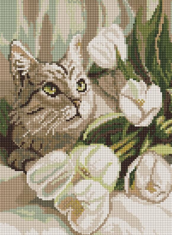 Алмазна мозаїка 30х40 AMO20099 Зеленоокий кіт з тюльпанами "Ідейка"