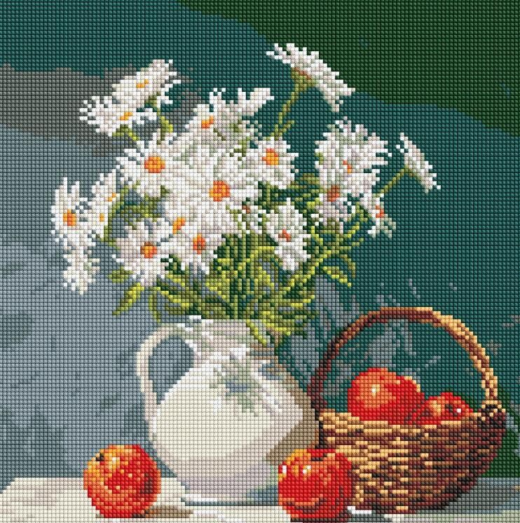 Набір алмазної мозаїки від ТМ Ідейка - це найкращий подарунок для близьких, коханих та рідних людей, який стане незабутнім презентом завдяки сучасному дизайну сюжетів! Викладка картин алмазною технікою є чудовим заняттям для зняття стресу, медитації та релаксу. Завдяки ефекту 5D, картини мають дивовижний, чаруючий об’ємний вигляд, який поглиблюється за допомогою огранювання кожного камінчика. Для вас ТМ Ідейка підготувала найяскравіші та найгарніші набори алмазної мозаїки на підрамнику, котрі не потребують додаткового оформлення в багетну рамку. Після закінчення роботи картина вже має закінчений вигляд і готова прикрашати вашу оселю. Склад набору: - полотно з клейовим шаром і кольоровою схемою, яке оформлено на підрамник галерейним способом, - акрилові стрази згідно комплектації набору (круглі), - спеціальна ручка-стилус для роботи зі стразами з м’яким тримачем та 3 додаткових насадки для нього: для 3-х і 9-ти камінчиків-стразів, та насадка для вирівнювання стразів на полотні, - два гель-клея, - лоток для сортування стразів, - зіп-пакети для стразів, - інструкція. Алмазна мозаїка - Букет ромашок з яблуками ©art_selena_ua для вашої творчості в інтернет-магазині Ideyka. Виготовлено в Україні. Кольори готової мозаїки можуть незначно відрізнятися від показаних на зображенні! Склад набору та аксесуарів, що не впливають на використання і функціональність набору, можуть бути змінені виробником без повідомлення та відрізнятися від зображених на сайті!