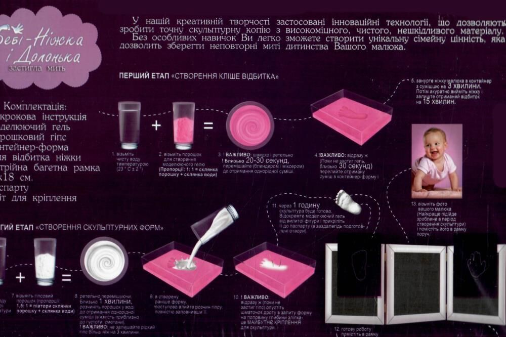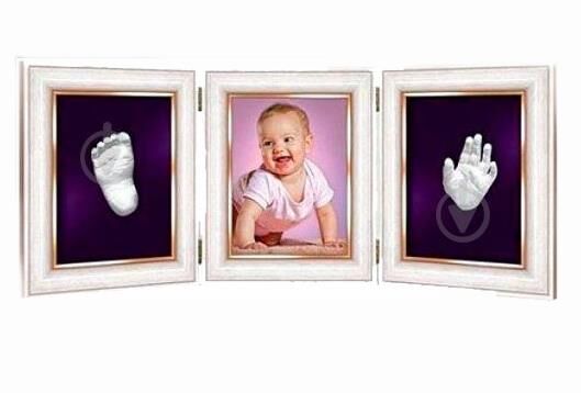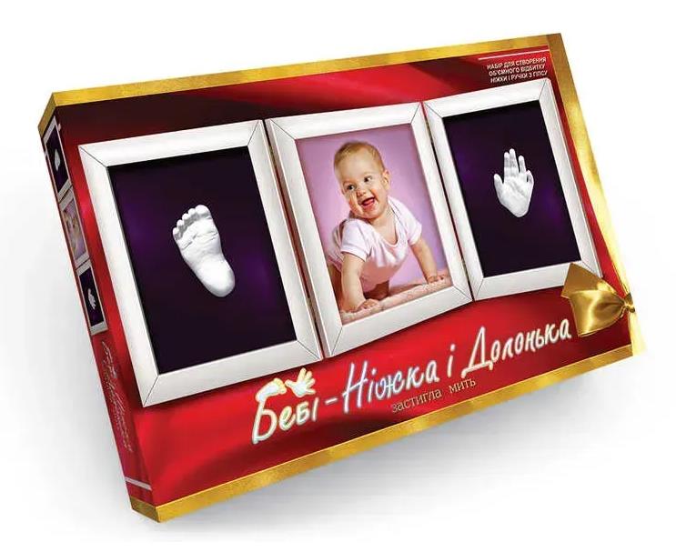 Набір для творчості "Бебі-Ніжка і Долонька". Ви легко зможете створити унікальну сімейну цінність, яка дозволити зберегти неповторні миті дитинства Вашого малюка. У комплекті: моделюючий гель, порошковий гіпс, контейнер-форма для відбитка долоні, потрійна багетна рамка (18 х 13 см), паспарту, кріпильна дріт.