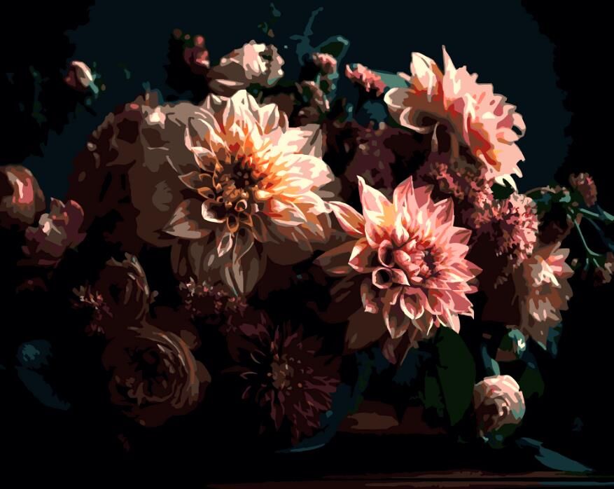 Розпис по номерах 40х50 AH1252 Рожеві жоржини на чорному фоні "Strateg"
