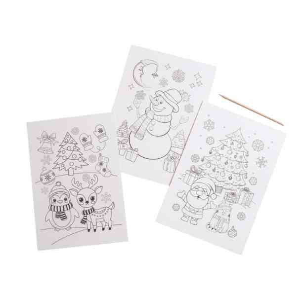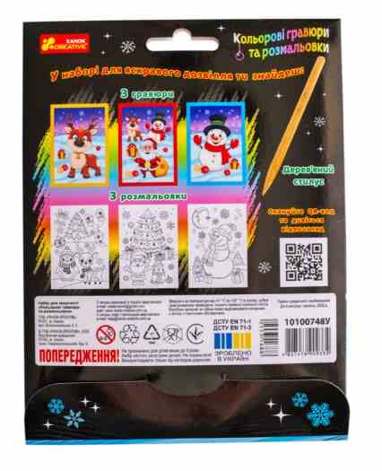 У комплекті 6 в 1: 3 яскраві кольорові гравюри та 3 чорно-білі розмальовки з казковими новорічними героями – оленятком, Святим Миколаєм, сніговичком, пінгвінчиком і котиком біля ялинки. До складу набору також входить якісний дерев’яний стилус, за допомогою якого можна вицарапувати картинки.