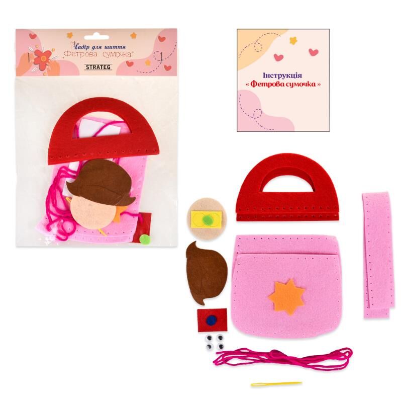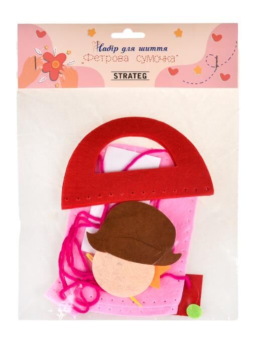 Розмір пакування: 28 х 20 х 1 см Вага: 30 г Комплектація: фетрова основа для сумки, елементи з фетру, декоративні елементи, нитки, пластикова голка.