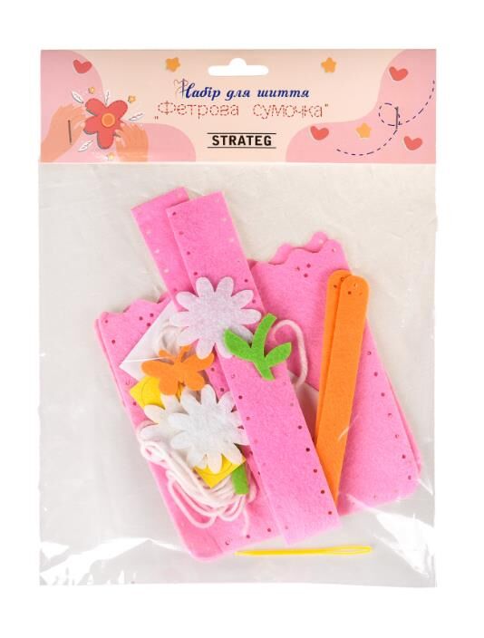 Розмір пакування: 28 х 20 х 1 см Вага: 30 г Комплектація: фетрова основа для сумки, елементи з фетру, декоративні елементи, нитки, пластикова голка.