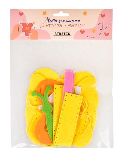 Розмір пакування: 28 х 20 х 1 см Вага: 30 г Комплектація: фетрова основа для сумки, елементи з фетру, декоративні елементи, нитки, пластикова голка.