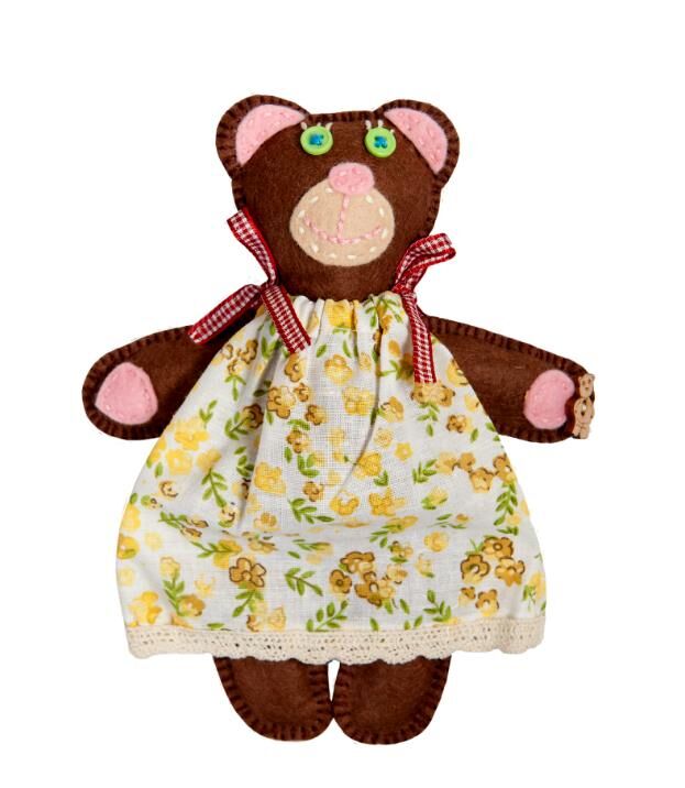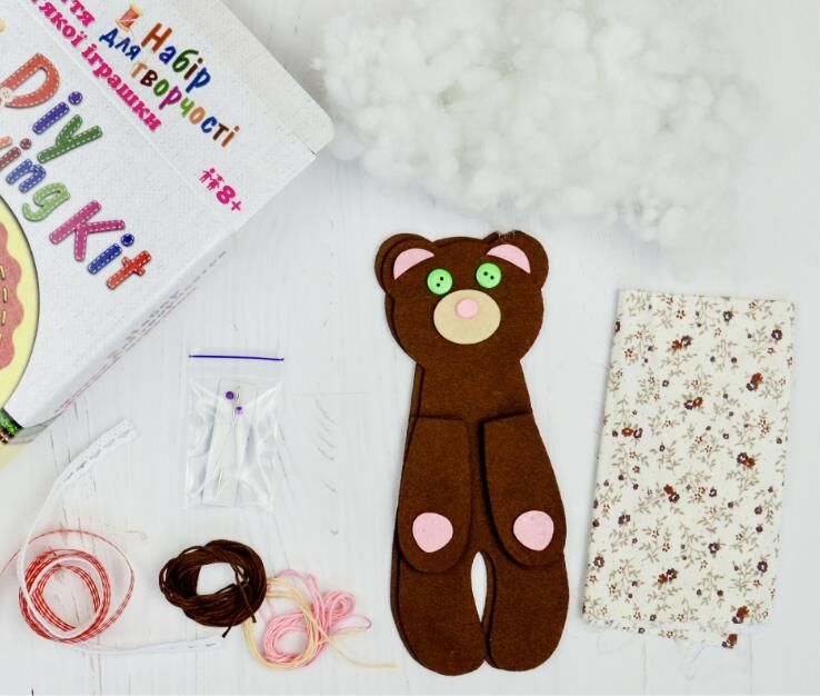 В наборі: вирубка з фетру, бавовняна тканина, нитки муліне, ґудзики, голка для шиття, холофайбер, стрічка, мереживо, булавки кравецькі.