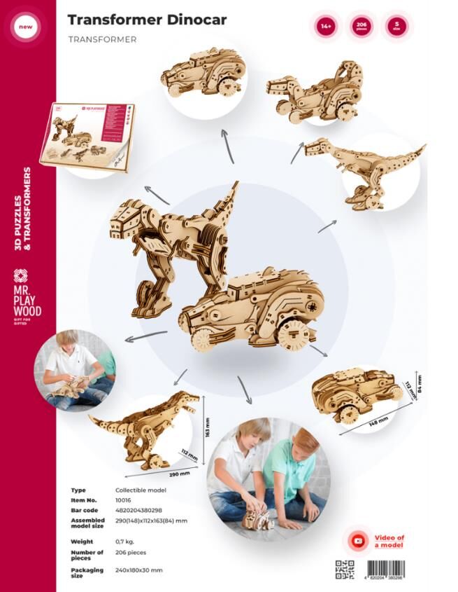 До вашої уваги нова модель з нашого ряду «Трансформери». Трансформер Дінокар є поєднанням давніх та сучасних подій. Динозавр Тірекс – тварина, як мільони років назад мешкала на Землі, за декілька рухів перетворюється у незвичній сучасний автомобіль, який більше нагадує всюдихід.