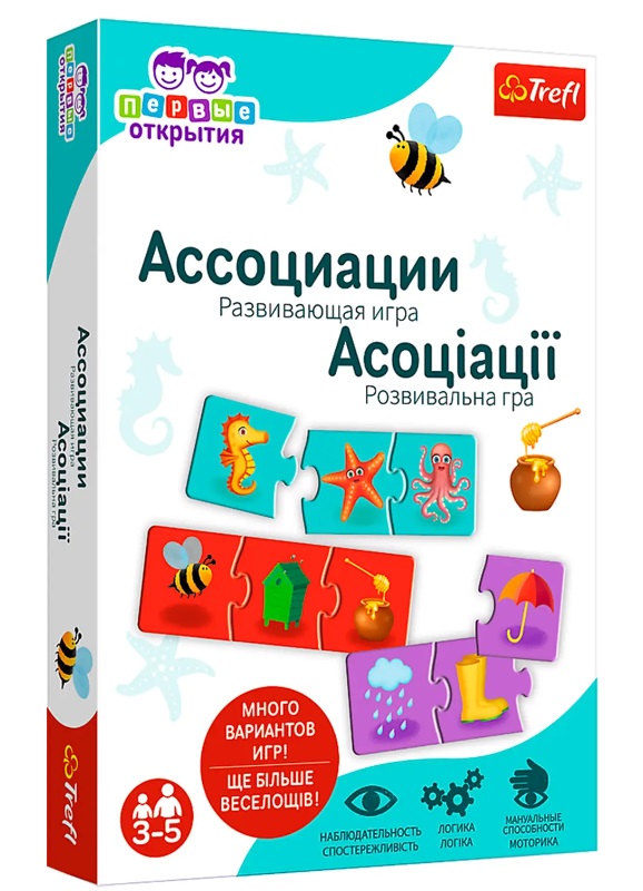 Асоціації це унікальна розвиваюча гра-головоломка для дошкільнят, яка навчить їх називати й групувати предмети та події. Дитина поєднує елементи головоломки і пізнає світ, розважаючись. Розвиває спостережливість, логі та моторику рук.