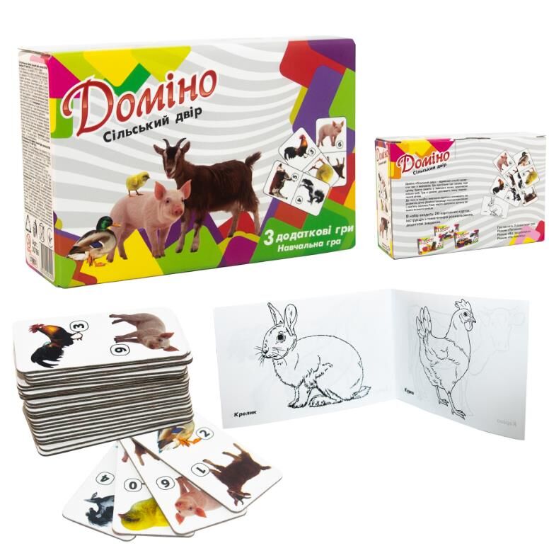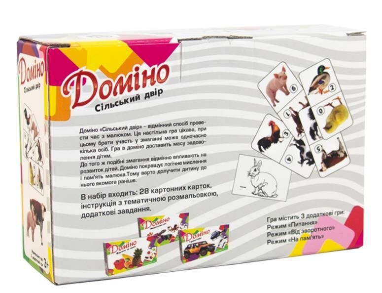 «Доміно Сільський двір» – популярна настільна гра у новому навчальному форматі. Тепер ігри стали не лише веселими, а й корисними. Яскраві картки наочно продемонструють малюкові мешканців сільського дворика, покращать його уважність та посидючість. Також у наборі є додаткові завдання, які допоможуть закріпити отримані знання!