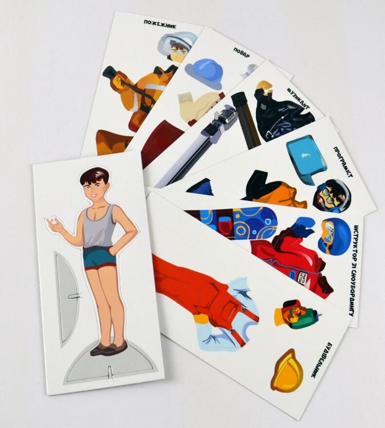 Склад: 2 ляльки висотою 18см: хлопчик та дівчинка, 12 комплектів одягу у виді багаторазових наліпок. Одяг та аксесуари для професій: інструктор зі сноубордингу, програміст, музикант, кухар, пожежник, будівельник (для хлопчика) та) та інструкторка з йоги, перукарка, стюардеса, лікарка, вчителька, поліціянтка (для дівчинки). Коробка 23х12,5х2,5см. Для дітей від 4 років.