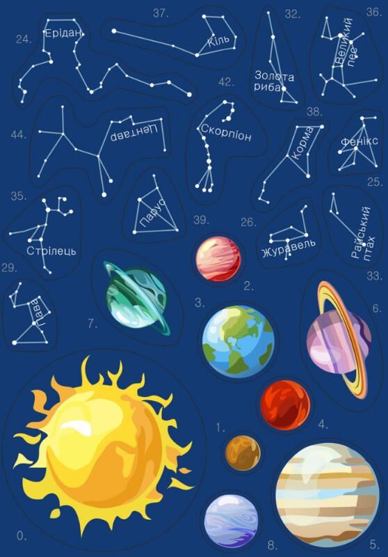 Поринь у загадковий космос разом з грою "Зоряне небо". Мальовничі наліпки допоможуть вивчити: - 45 сузірь; - планети Сонячної системи; - розташування небесних тіл. На Вас чекають: