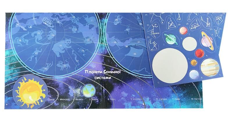 - багаторазові наліпки, що довго залишаються липкими;- реалістичні ілюстрації;- великий постер у вигляді зоряного неба, що прикрасить Вашу оселю.