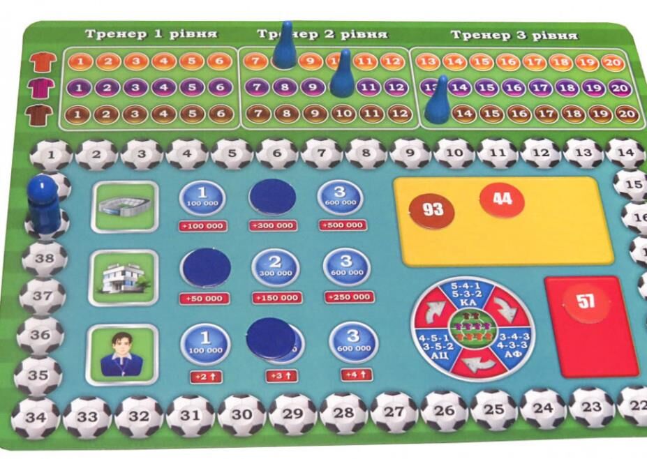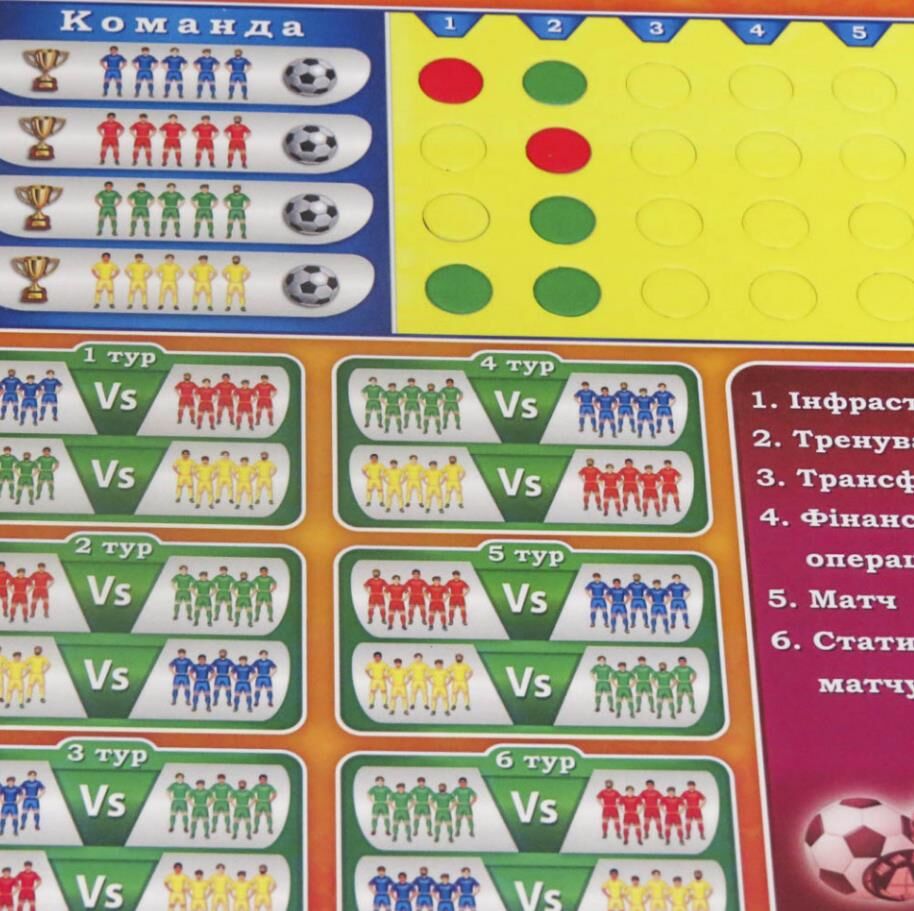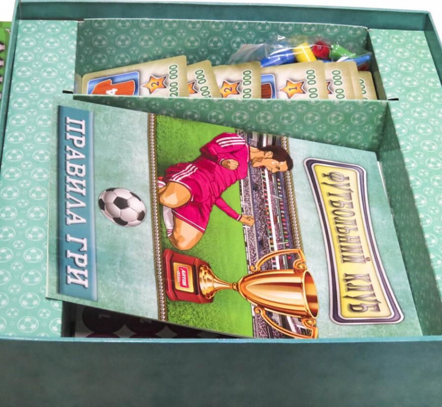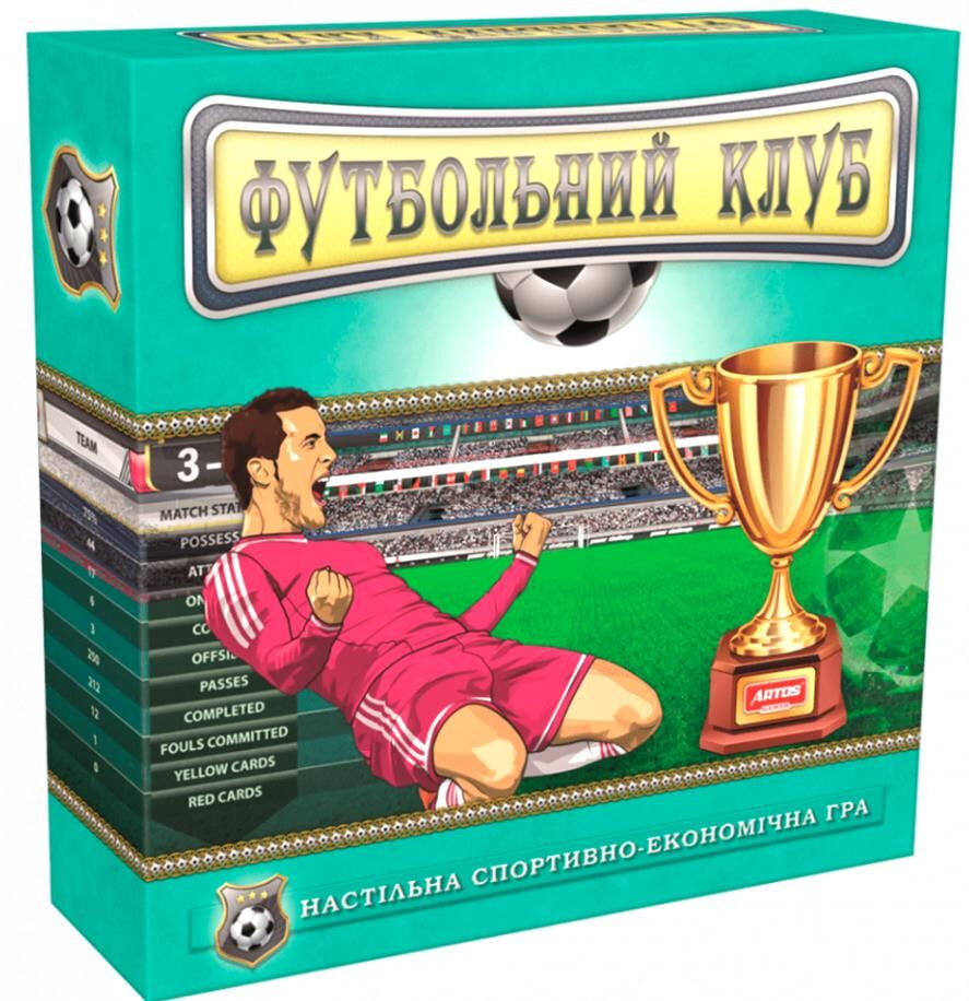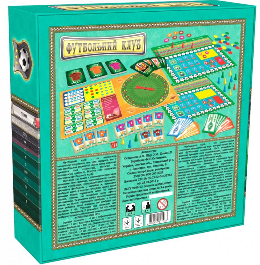 Дитяча настільна гра "Футбольний клуб" 0963, що поєднує все необхідне в комплекті, представлена в новій колекції для найвимогливіших маленьких шукачів пригод. Захоплююча економічно спортивна гра занурить гравця в цікавий світ футбольних перипетій, дозволить кожному проявити і розвинути свої стратегічні, тактичні та математичні навички. В процесі гри Ваш малюк зможе себе відчути справжнім власником футбольного клубу. Кожному з учасників належить розвивати свою команду, модернізуючи стадіон, магазин атрибутики і навіть тренерський штаб, купувати футболістів і організовувати футбольні матчі. За розвиток клубу і вдалі матчі гравці будуть отримувати прибуток, а також окуляри рейтингу вашої команди, які необхідні для перемоги в грі. Переможцем стає той, хто набере найбільшу кількість рейтингових очок. У набір входить 4 ігрових планшета, інформаційний планшет, 100 карток футболістів, 100 фішок футболістів, 12 карток віртуальних команд, гроші, фішки тренування, маркери характеристик, результатів матчу, кубик і правила гри для новачків.