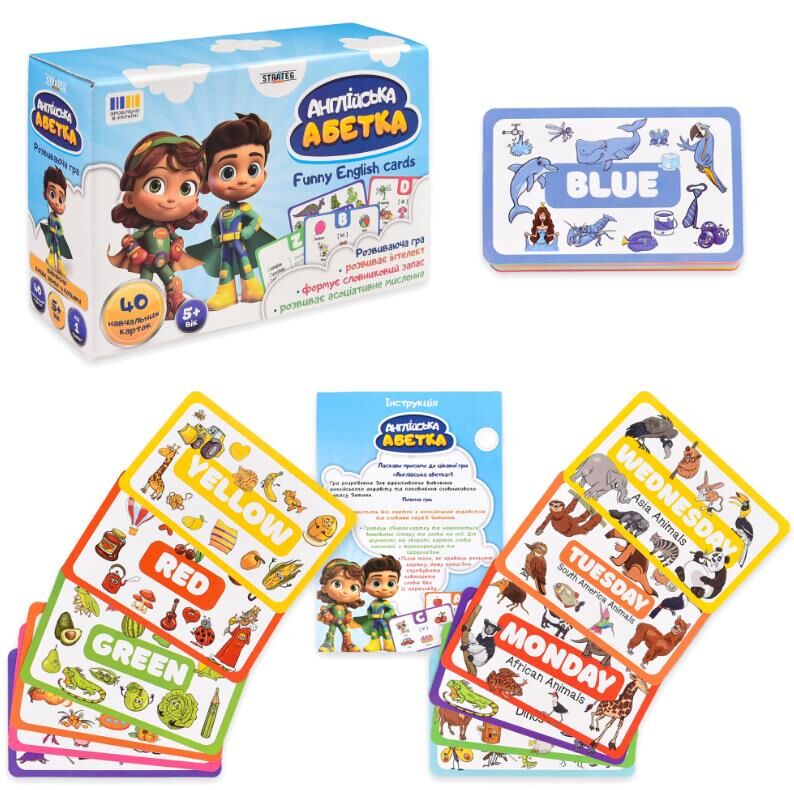 «Англійська абетка» — це ігровий набір для ефективного вивчення англійської мови та розвитку кругозору дитини. У грі 26 карток з літерами англійського алфавіту, 7 карток з днями тижня та 7 карток кольорів. Кожна картка доповнена яскравим малюнком, словом, транскрипцією та перекладом для швидкого поповнення словникового запасу та правильної вимови.