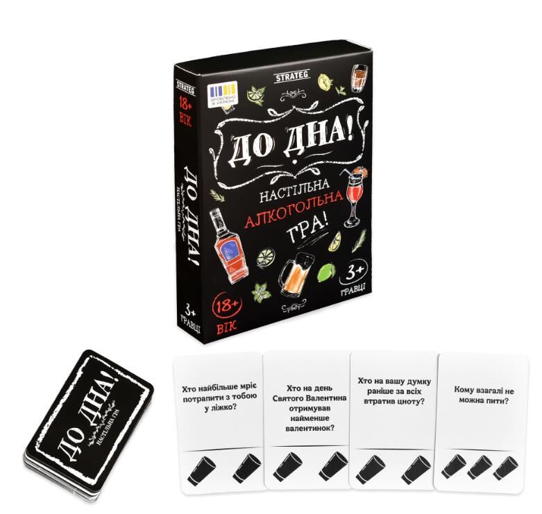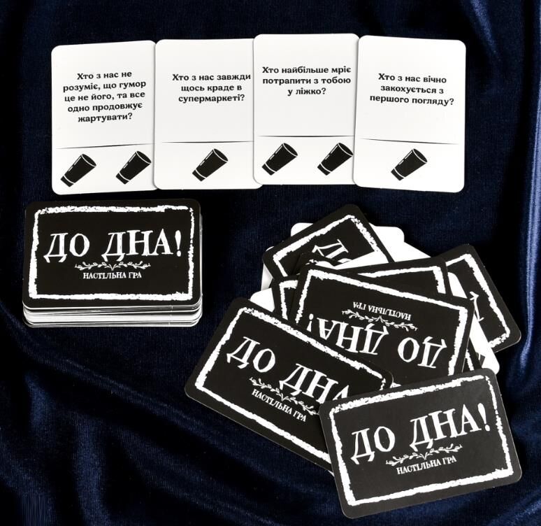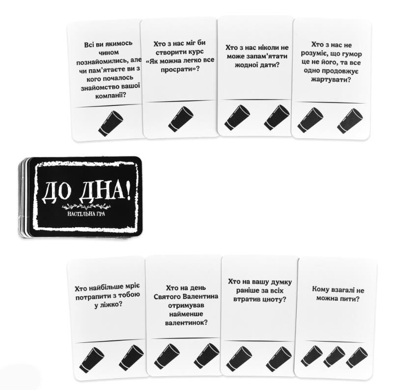 «До дна!» — це вибухово весела алкогольна гра з гострими, інколи дуже пікантними запитаннями, які миттєво розкривають вашу компанію з абсолютно нового боку.