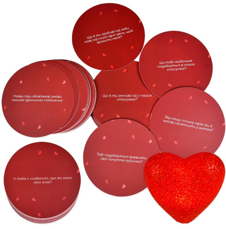 Вік: 16+ Розмір коробки: 17 x 11 x 11 см (тубус) Вага: 318 г Комплектація: коробка (виготовлена з картону), гральні картки — 71 шт., ліхтарик-сердечко, інструкція.