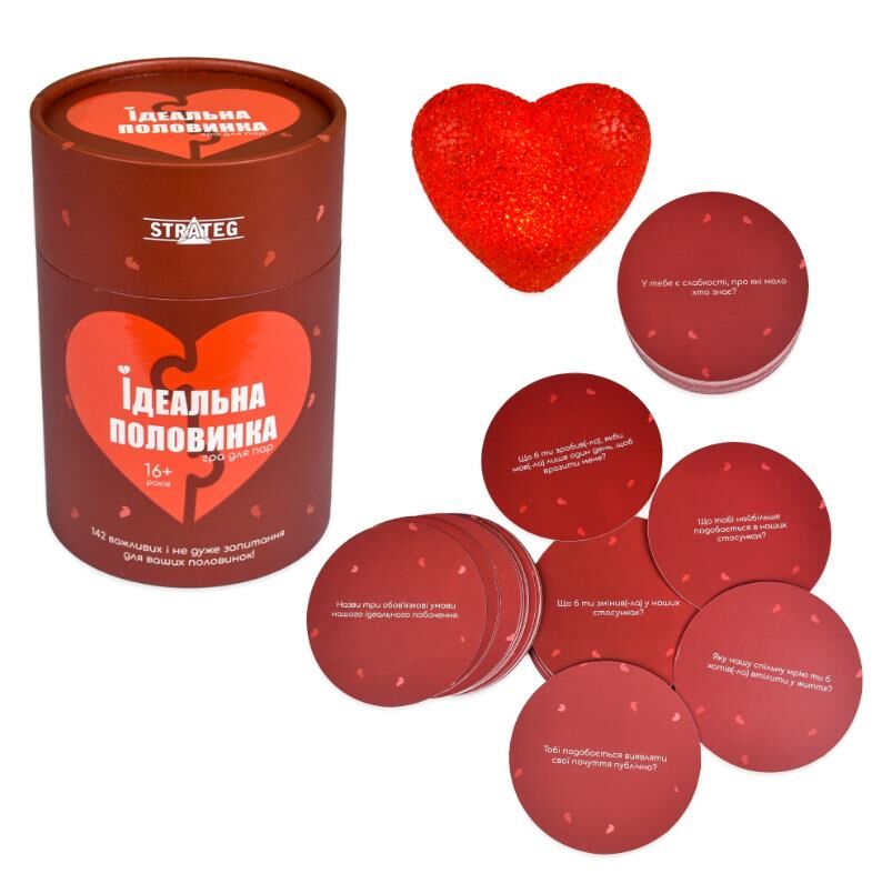 «Ідеальна половинка» — це настільна гра для пар, яка допомагає говорити про важливе легко, чесно й без незручності. Усередині — 142 запитання, які відкривають почуття, думки, мрії та маленькі секрети. Гра підходить як для пар, які разом уже давно, так і для тих, хто лише починає свій шлях. Вона чудово впишеться у романтичний вечір удвох, стане оригінальним подарунком або приємним приводом побути разом без телефонів і поспіху.