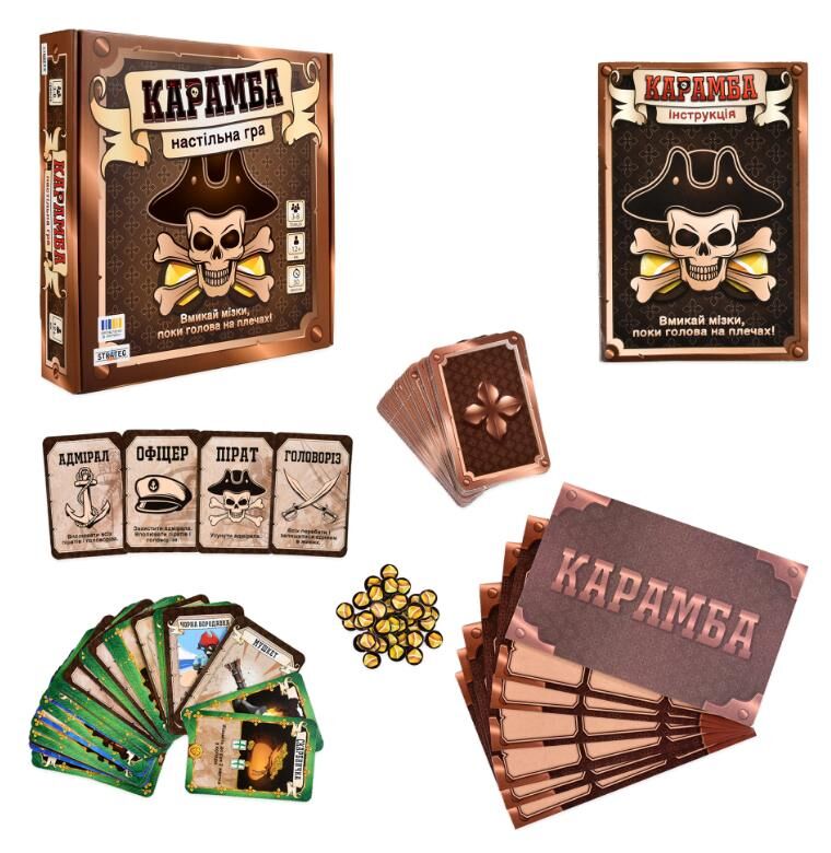 «Карамба» — настільна гра не на життя, а на смерть. Кожен гравець отримує свою роль і має досягти власної мети: адмірал з офіцерами полює на піратів, пірати прагнуть повалити адмірала, а головоріз насолоджується хаосом і воює проти всіх. У грі панують блеф, ризик та справжня піратська непередбачуваність — жодна партія не схожа на попередню. Хитруйте, домовляйтеся й бийтеся до останнього жетона золота! Вік: 12+ Розмір коробки: 25,7 х 25 х 5 см Вага: 375 г