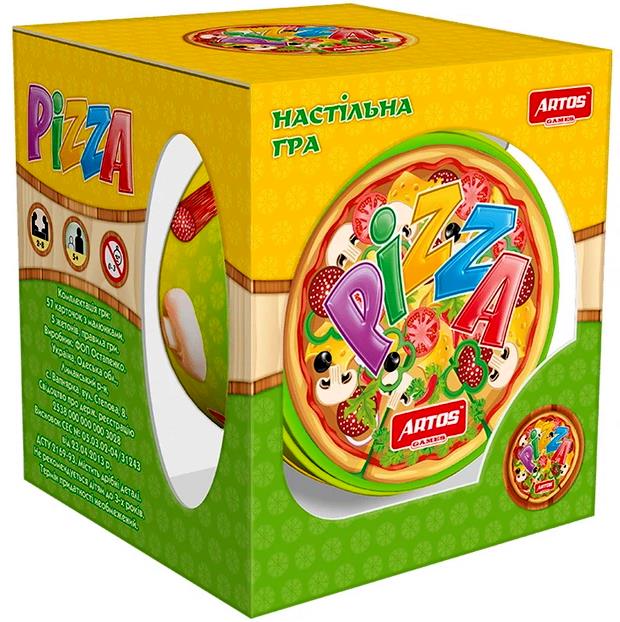 «Pizza» – весела динамічна настільна гра з простими правилами, що розвиває зорове сприйняття, увагу та концентрацію. Ця гра чудово підійде як дітям, так і дорослим. Для гри використовується колода з 70 круглих карток із зображеннями різних варіантів піци та 5 жетонів з інгредієнтами. У цих дивовижних піцах учасникам доведеться знайти правильний інгредієнт. ЦІЛЬ ГРИ. Схопити правильний інгредієнт і в результаті зібрати найбільше карток.