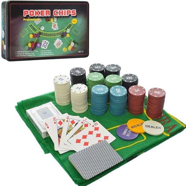 Гра настільна покер 300 фішок 2 колоди карт сукно в металевій коробці A164