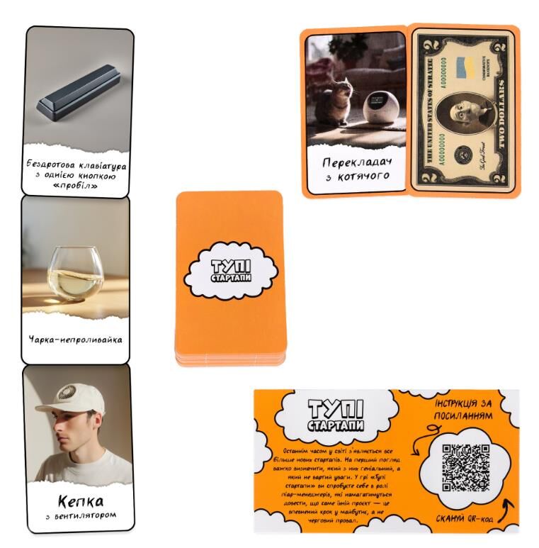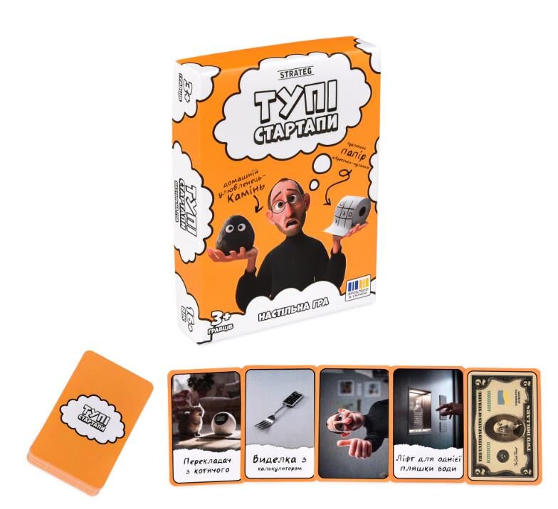 Тупі стартапи — настільна гра для компаній з почуттям гумору, у якій потрібно презентувати найдивніші та найсмішніші “стартапи”. Отримайте одну з 110 карток стартапів, спробуйте знайти переваги там, де спершу здавалося їх немає, та спробуйте довести іншим, що саме ваша безглузда ідея в майбутньому допоможе заробити мільярди.Комплектація: картки - 110 шт., картка з QR-кодом. Вік: 16+ Розмір: 10х14х2,5 Вага: 181 г