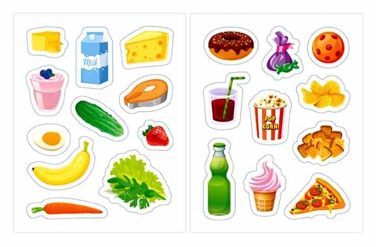 Гра «Що корисне, а що шкідливе?» — дитина кладе продукти на веселий або сумний зуб.